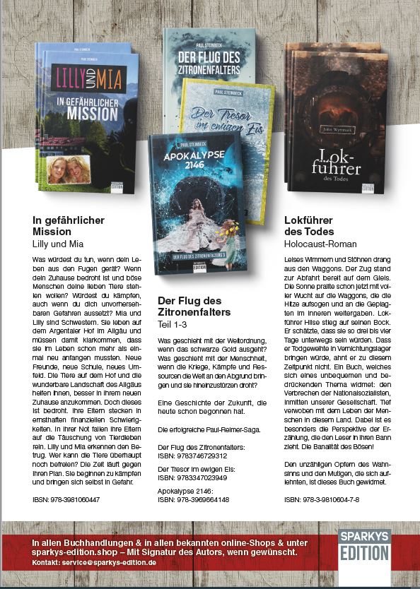 Vielen Dank an meinen Verlag Sparkys Edition, dass ich vom 11.-28. November mit meinen Büchern auf den Stuttgarter Buchwochen sein kann. Ich freue mich schon sehr darauf und werde immer wieder selbst vor Ort sein. Meldet Euch, wenn Ihr kommt. Vielleicht kann ich es ja zeitlich einrichten. Auch mein Autorenkollege im Verlag, John Wyttmark wird mit seinem historischen Roman Lokführer des Todes präsentiert werden. https://buchwochen.de/programm/