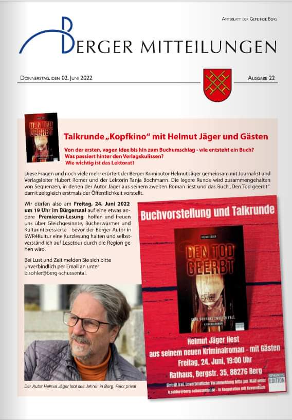 Jahrgang 1951 Helmut Jäger ist gebürtiger Oberbayer und gelernter Buchhändler. Er war im Verlagswesen und in der Sportartikelbranche tätig. Zum Schreiben ist er in den Siebzigerjahren als Mitglied des Münchner Poetenstammtischs gekommen. Seit 1991 lebt er mit seiner Familie in der Nähe von Ravensburg. Sein Faible für Krimis, insbesondere