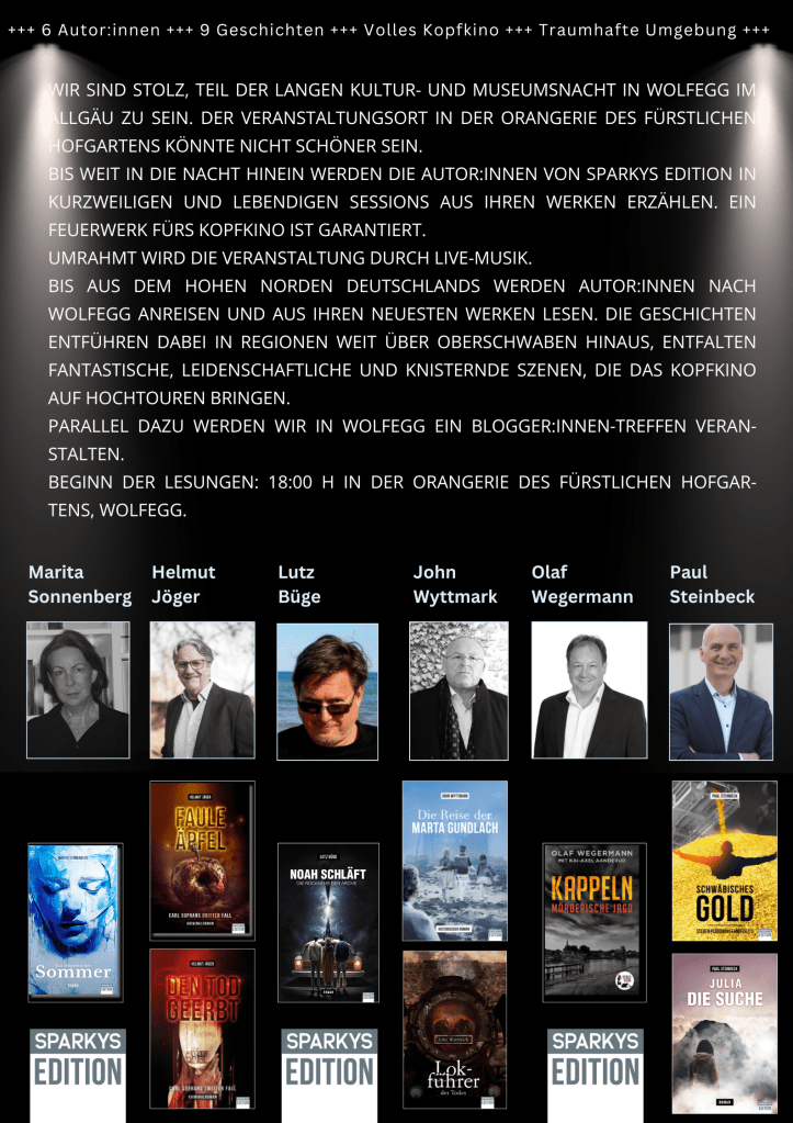 Wolfegg im Allgäu zählt zu den schönsten Dörfern Deutschlands. Dieser Ort liegt eingebettet in die sanften Hügel Oberschwabens, hoch über dem romantischen Achtal. Von den Hügeln bietet sich ein traumhafter Blick weit in die Alpen hinein. Wolfegg atmet Geschichte und Kultur in vollen Zügen. Wir sind dankbar und stolz, Teil der Veranstaltung Wolfegger Kultur- und Museumsnacht zu sein. Der Veranstaltungsort in der Orangerie des fürstlichen Hofgartens könnte nicht schöner sein. Bis weit in die Nacht hinein werden die AutorInnen von Sparkys Edition in schnellen und lebendigen Sessions aus ihren Werken erzählen. Ein Feuerwerk fürs Kopfkino ist garantiert. Umrahmt wird die Veranstaltung durch Live-Musik. Parallel dazu werden wir ein BloggerInnen-Treffen veranstalten
