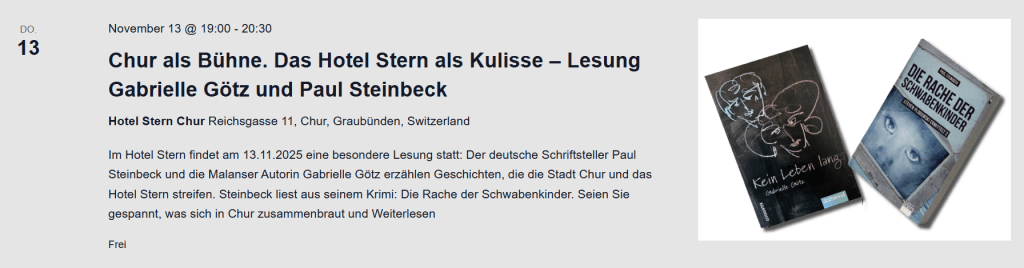 Woche für Woche, beinahe Tag für Tag gibt es bei uns nicht alltägliche Lesungen! Beispielsweise in Chur mit Gabrielle Götz und Paul Steinbeck. Am 13. November.